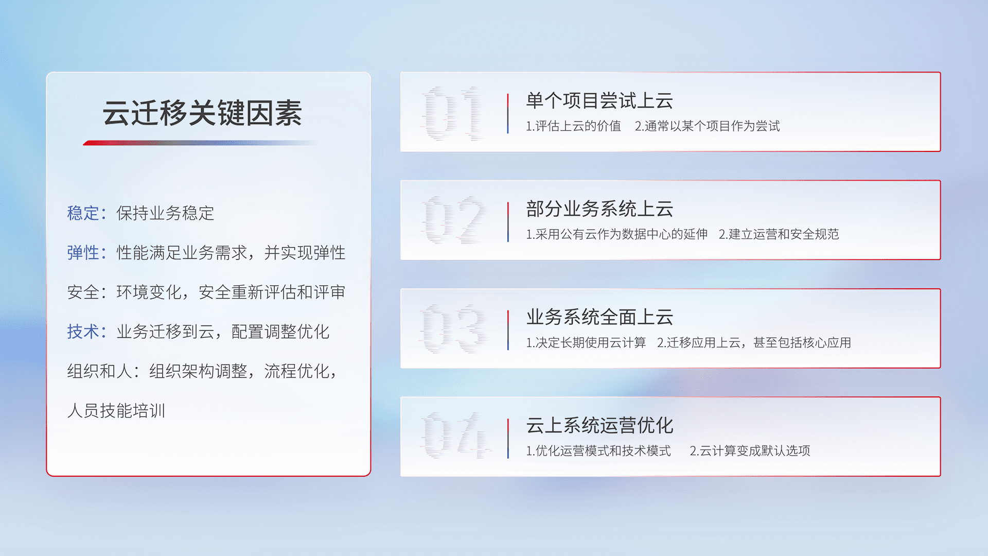 结合实际业务,,从规划设计、、、云平台选型、、云原生改造、、数据迁移、、集成交付,,,,迁移全过程为客户识别最佳上云路径,,做好风险识别管理,,,设计网络架构、、身份权限、、、安全审计合规、、、操作审计、、日志审计、、、、监控告警策略、、、、多站点容灾设计等,,,,对云上基础设施进行整体规划,,提升IT治理水平,,以满足弹性、、、、高可用、、、、高性能的需求。。。。