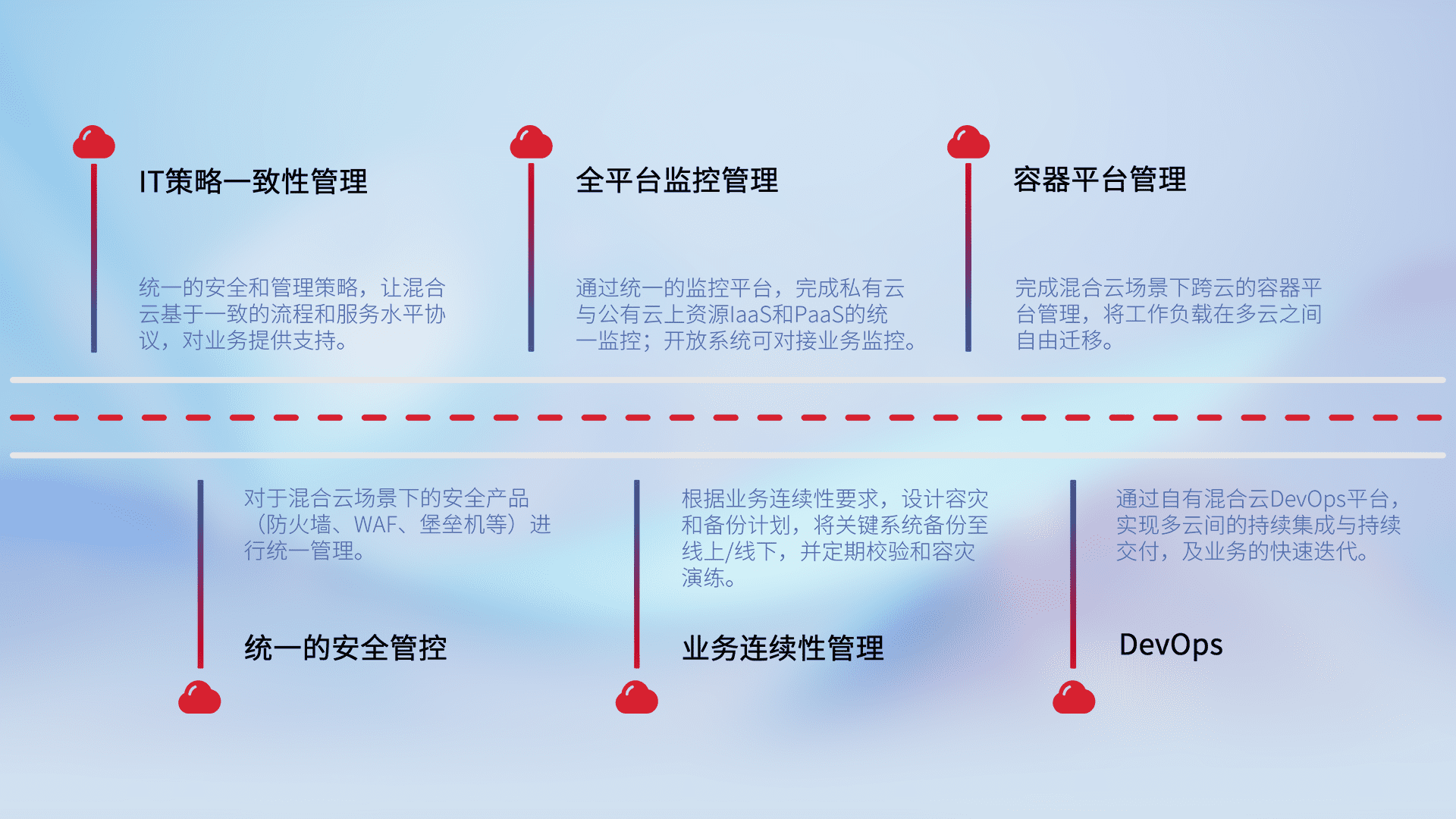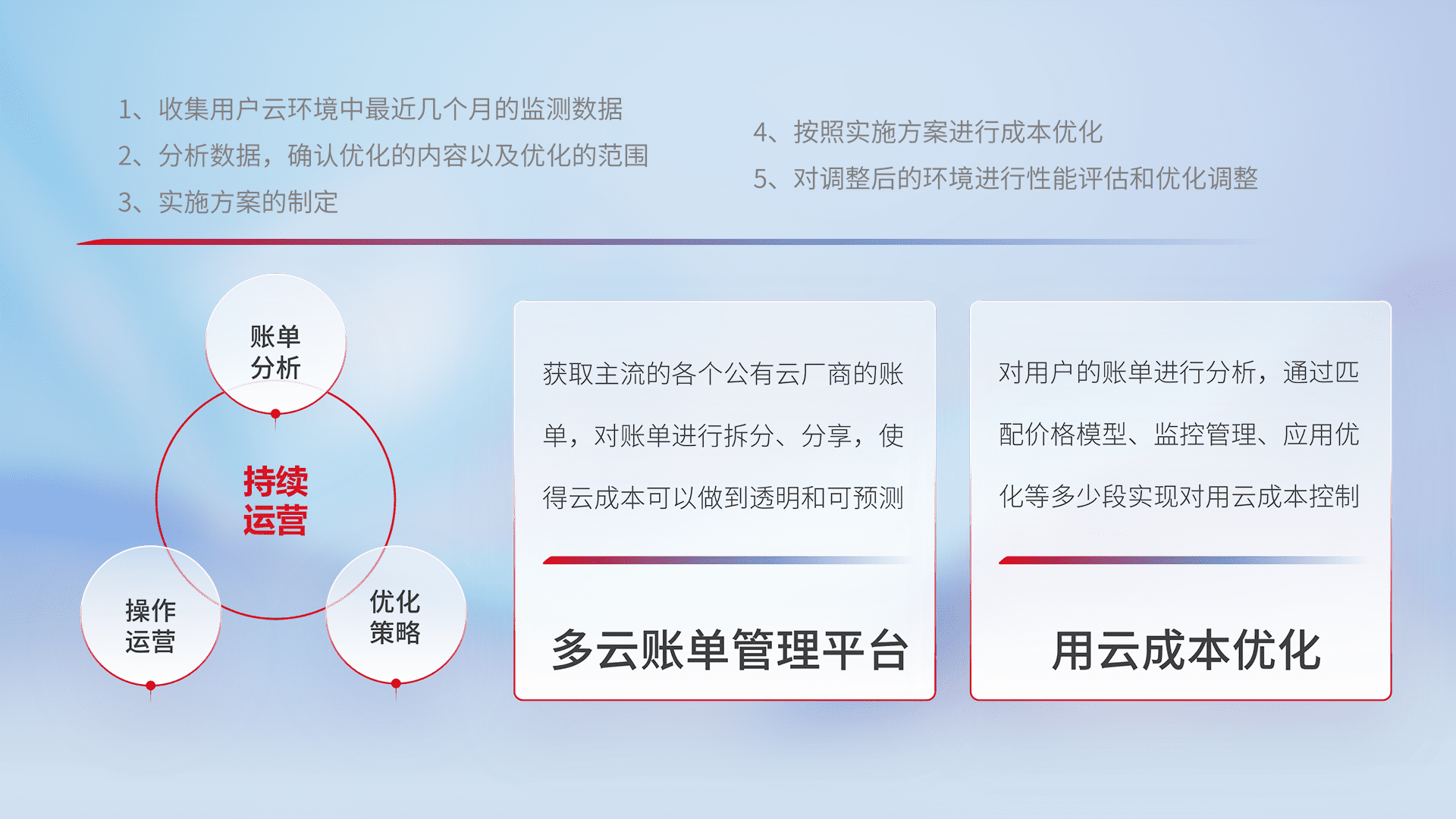 通过多云纳管,,以统一的资源数据模型把客户的云资源进行抽象和封装,,进而实现对多云资源的统一操作,,,保障云资源管理的可靠性、、、稳定性与可用性。。量身定制化运维内容,,配置、、开发运维、、、、补丁管理、、、备份、、监控、、认证和访问管理、、审计和日常巡检等,,,保障在用云过程中的可靠度,,稳定度以及高可用率。。。。