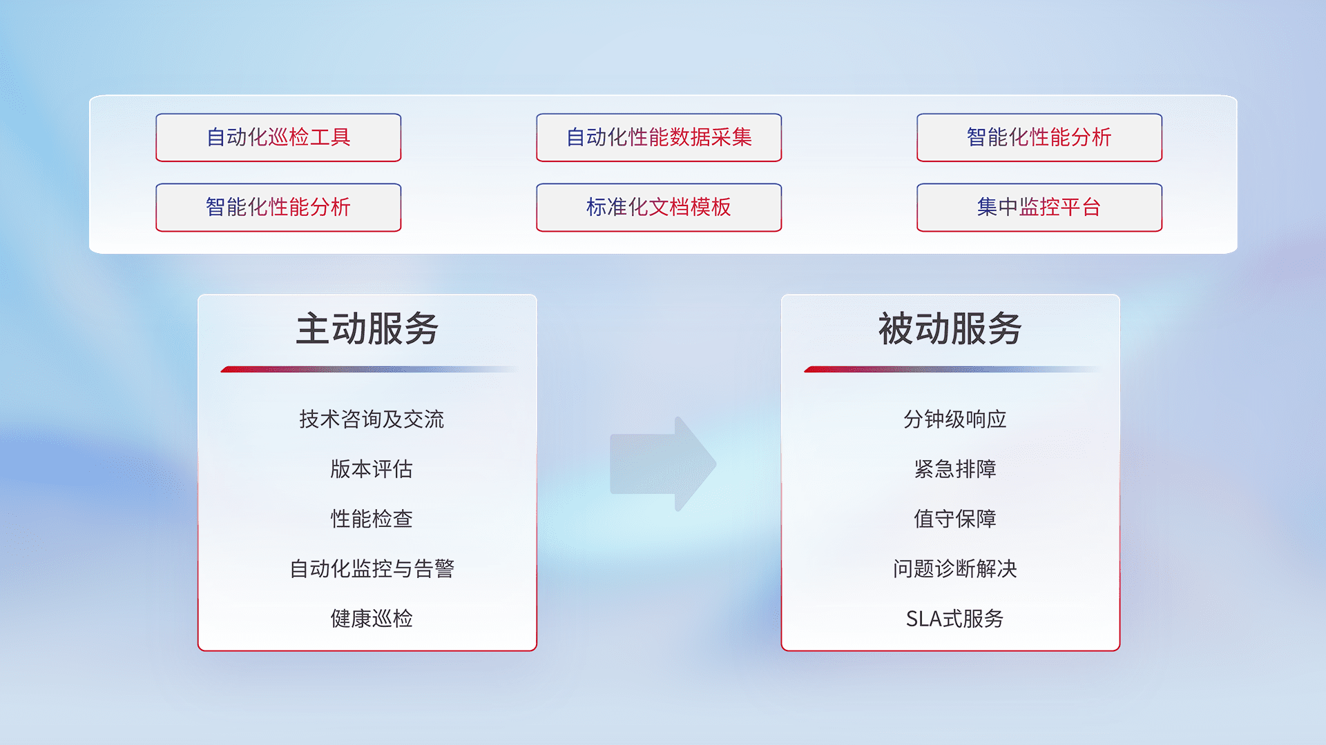 智能化工具和标准化文档,,保障服务质量,,,提供主动服务(包含技术咨询、、、、版本评估、、、、性能检查、、自动化监控与告警、、健康巡检)和被动服务包含(分钟级响应、、、、紧急排障、、、值守保障、、问题诊断解决、、、、SLA服务)。。